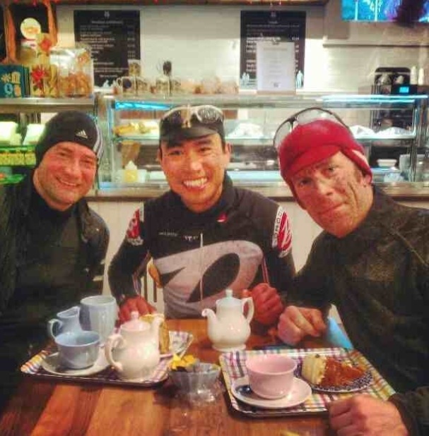 Be not fooled by these comfortable smiles. Peer closer, through the instagram’d veneer, to another layer – the film of grime and grit that no ersatz 70’s fake antique Polaroid can mimic. No, the mask worn by these riders tells a tale of hardship and suffering that one could overlook, given the chintzy National Trust setting and the fine tea service on display. It is the ROAD, reader, the road that has written its cruel lines on the faces of these brave hearts. The range of cakes available in the centrally heated cafe atop Box Hill might have been superb, and the tea plentiful, but don’t be fooled by the chance timing of this picture’s arbitrary moment. Look beyond those eyes at the freezing rain that had lanced down upon bike and rider since departing that cold, bleak day. See etched there the misery of punctures, non-adhesive patches, bulging inner tubes, and the cruel futility of the mini pump. Alas, that this should be maiden voyage of one Craig Mackenzie, fresh from the rigors of Regents, unschooled in the art of sitting on Lowell’s wheel, naive to the rhetoric of pain. Pity his innocent expression that seems to say “We’ll, this isn’t so bad, what’s the fuss about?” No, poor novice, life in the Baroudeur chain gang is not all tea for one and china plates; it is dirt, it is pain.