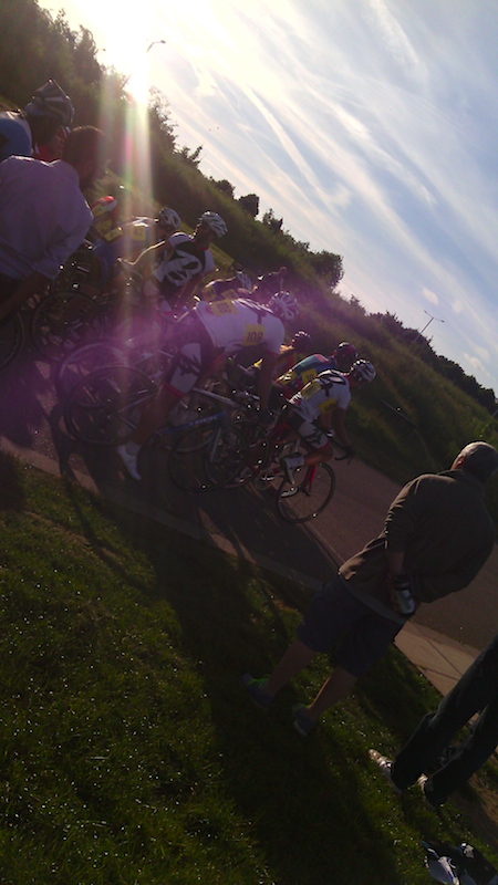 Mike smoothly rides his way up the peloton, but we lose Mark. On the next turn we find him. He’s down, but not completely out. Good man, is giving it all he’s got.