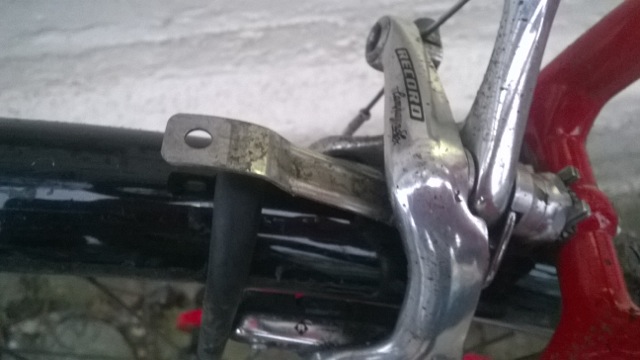 As you can see from this Cannondale, there isn’t much room to fit proper mudguards. That’s because it probably wasn’t designed to take any. Even the famous Crud-Racers aren’t able to do the trick. When the RBL arrived, I was inittially perplexed that they too failed to find space between the brake calipers and tyre. This was easily remedied by creating a shim out of cardboard to create the necessary clearance. Wedging it on top of the tyre allows the brackets to sit as upright as possible; and hey presto, it works.