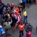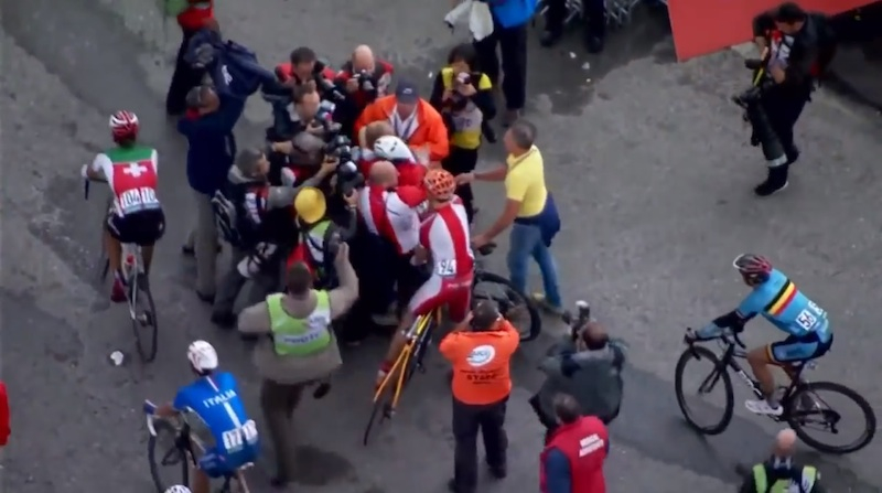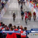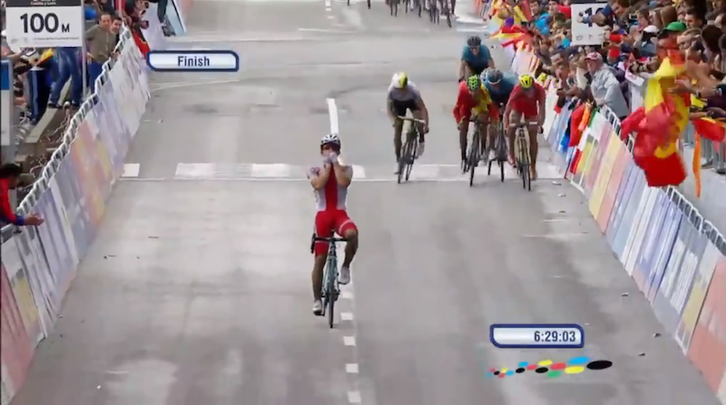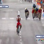 Moments when the race was won: inch-by-inch the chase group near the Pole. He looks back, but seems confident; wiping his face for the final metres. Michal sits up with still 100m to go, kisses the red-eagle on his Polish jersey and salutes the world, triumphant!