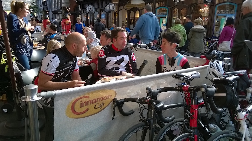 The stretch of road into town is straight and long, letting us spin, before sweeping through the roundabout, up the hill and into the arcade. Our reward awaits us at the Cinamon Cafe.