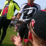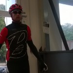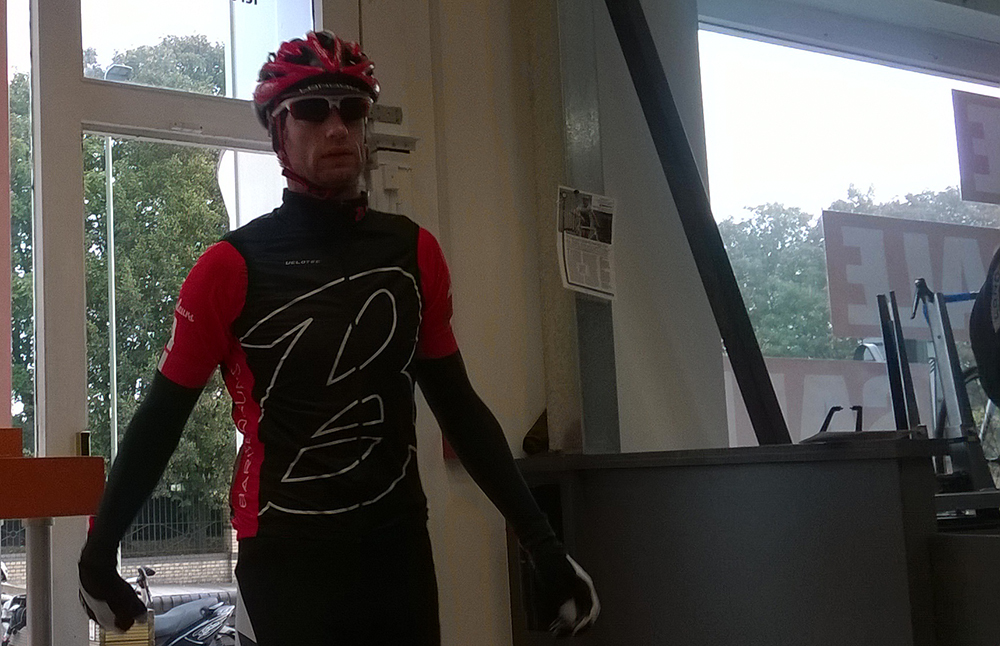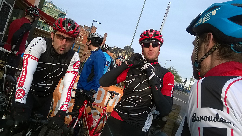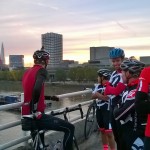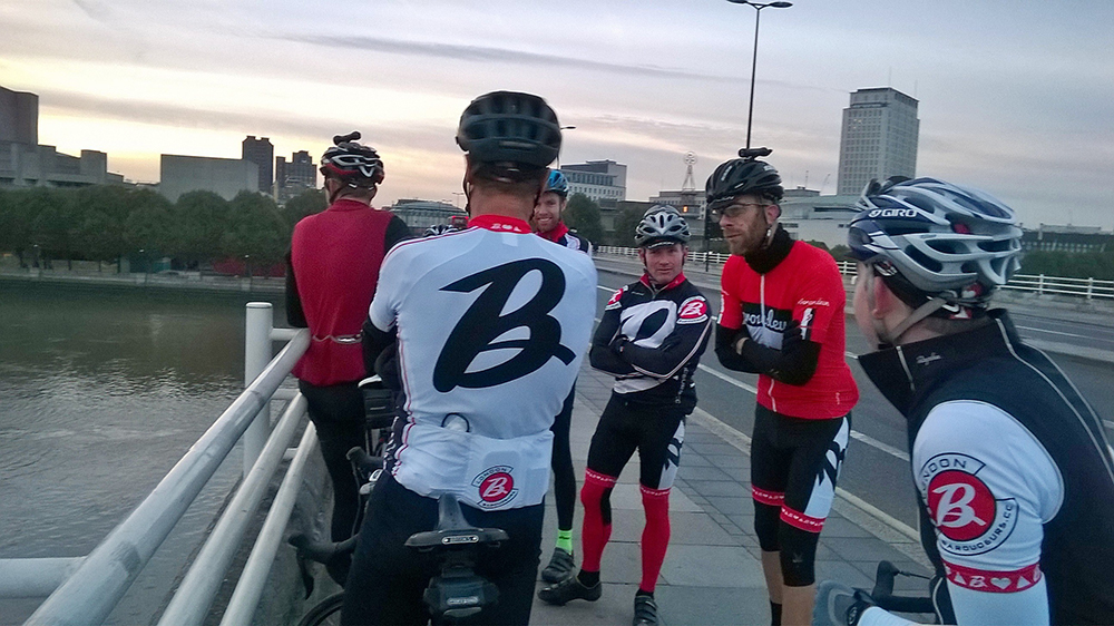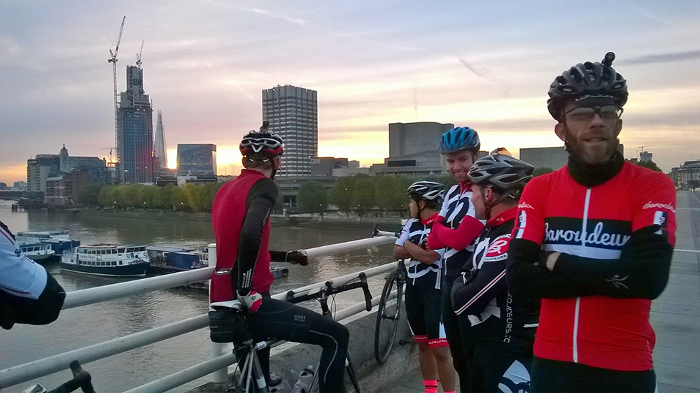 Waterloo, as the sun rises. Cold, uncoordinated kit, but still smiling.
