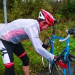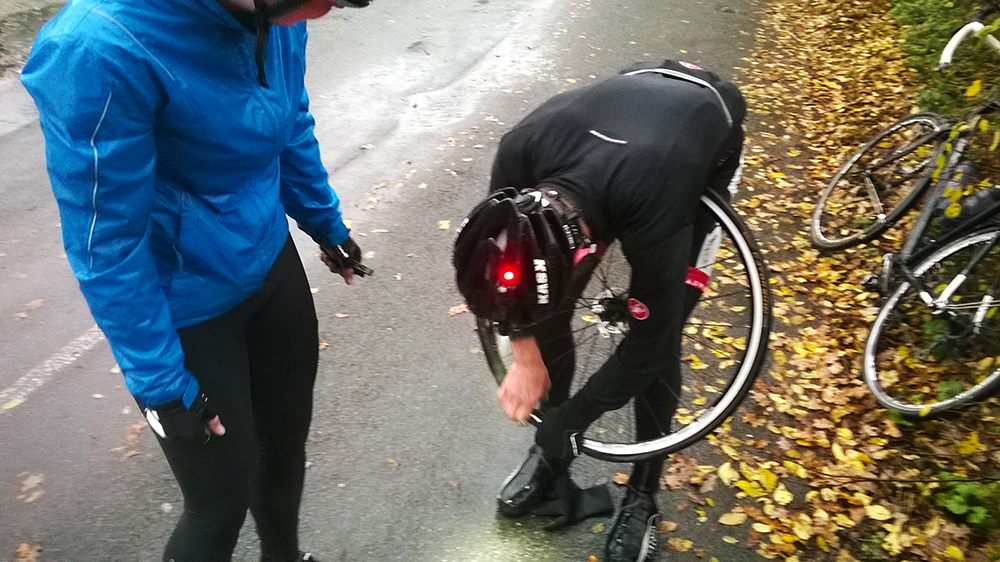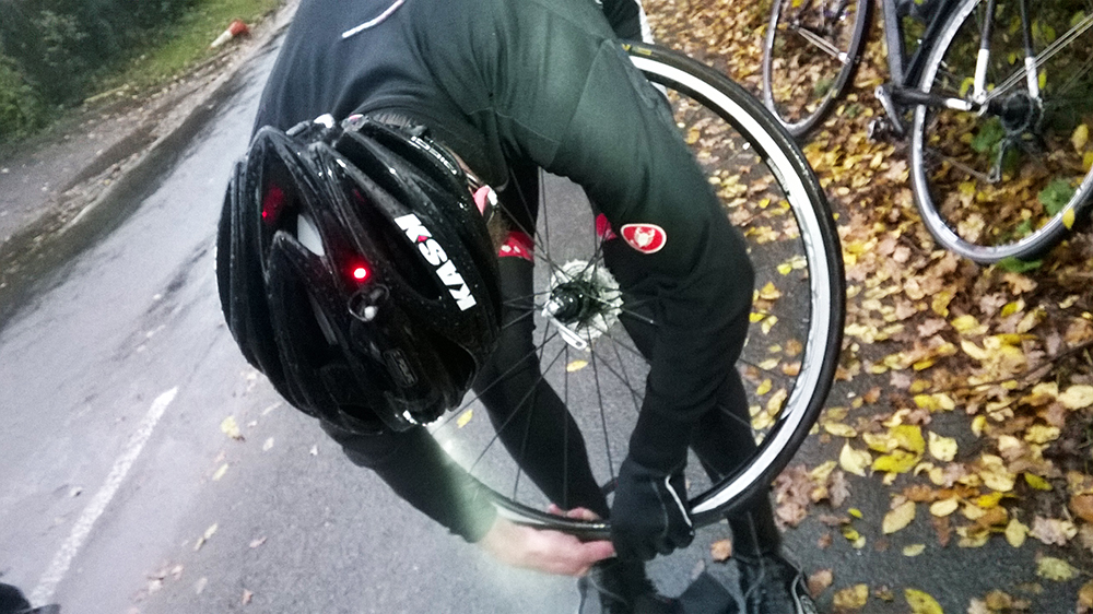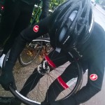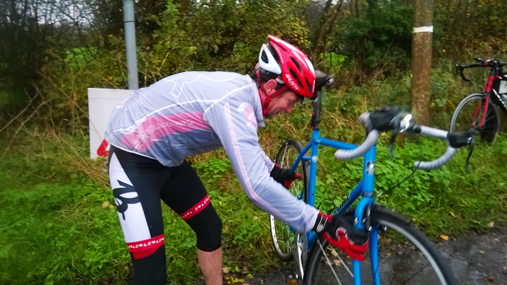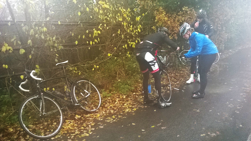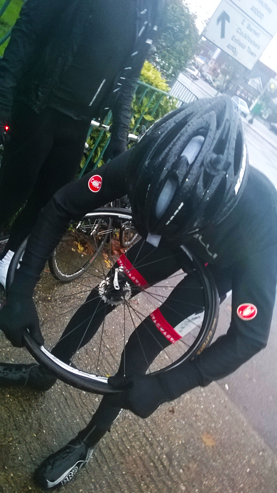 For the next 10 minutes I’m racing to get back onto the bunch. There’s roughly 2o miles left and I’m in no condition to ride this alone. As I near a junction a familiar kit comes into view. It’s a flat. Worrying that Rebecca would lose patience with the earlier mishaps and regret coming out, I’m relieved to find out that she’s hit hard-luck. The silver-lining is that this day, it can happen to anyone. Not just those on shiny blue fixed-gear bikes.