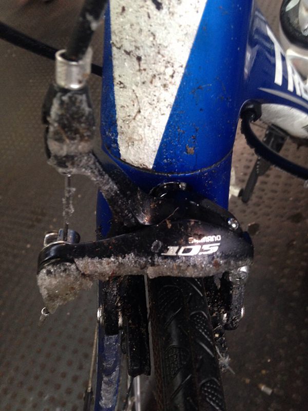 Add to this freezing conditions that create snowflakes to your eyelashes. Icing up your bidons, spoke blades and even your brakes, it doesn’t make it a pleasant 120+ mile adventure.