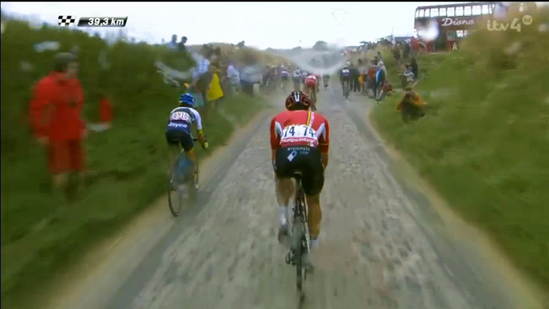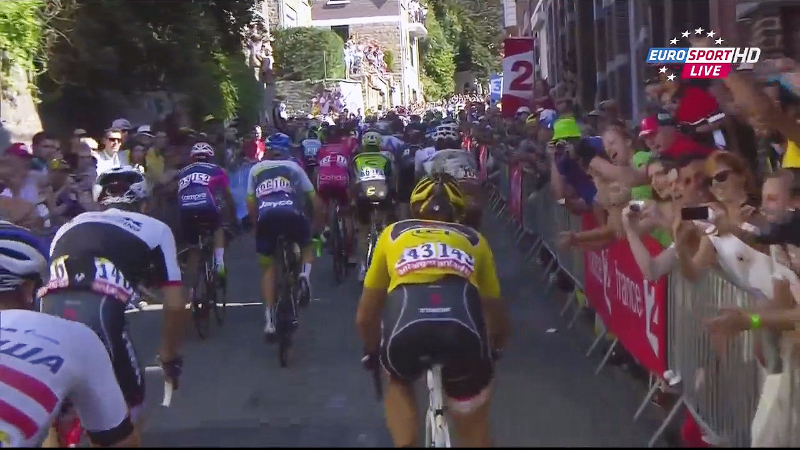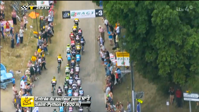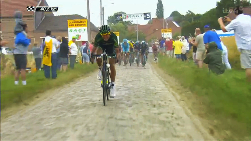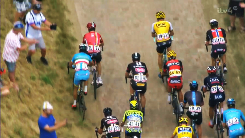 If Stage 3 was presented as a mini Flèche-Wallone, then Stage 4 was the return of the mini Paris-Roubaix. Before we get to the mountains, this is the colossal stage of the Tour. At 220km, it leaves Seraing, Belgium in the sunshine and gets wet just as we leave the cobbles and race into Cambrai, France. Thankfully, for the most part, the cobbles aren’t a problem and blesses the peloton with good weather, but not necessarily comfy. As expected, with everyone, including Froomey preparing well in advance, Nibbles doesn’t perform as well as last year. Everyone gets in the mix for the team – with Cav leading out the peloton to get Etixx up the road and in control. The surprise is seeing Quintana keep with the leaders; later being described as the ‘Little Ninja Warrior’.