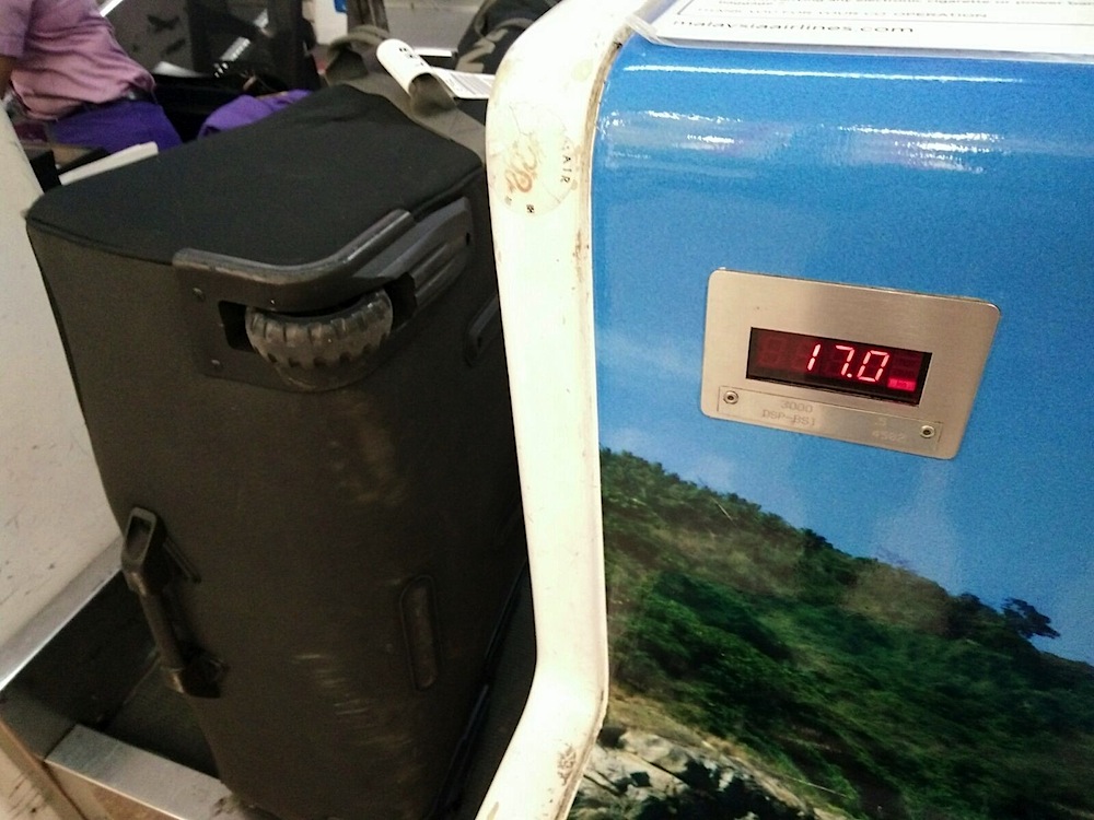 With all the travelling kit combined: that includes the bikes, we now top it up to 17.2 kilos max; the scales at the airport show 17.2, but eventually levels off to 17.0 kilos. Bingo!