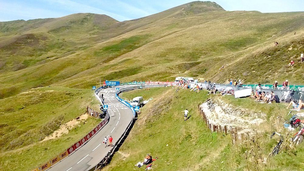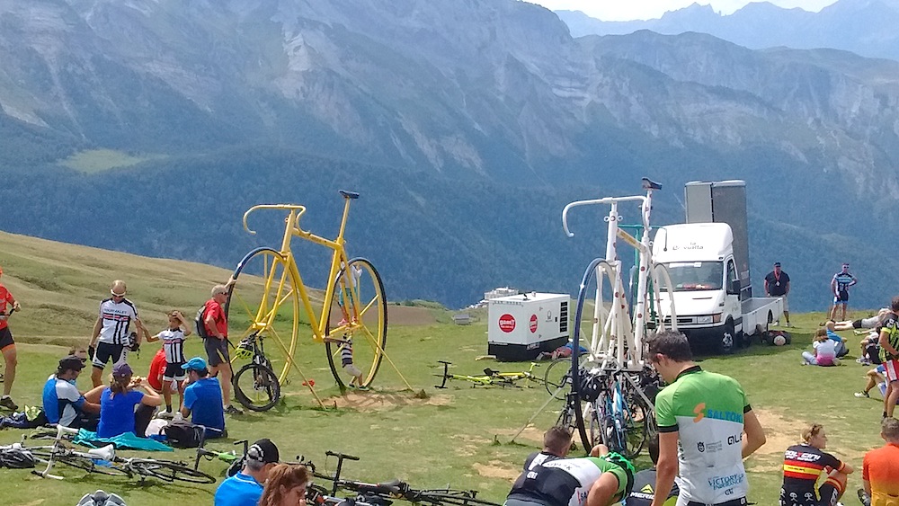At the top the view was stunning, there are three oversized bikes overlooking the climb, yellow, green and polka dots.  We waited, baking, at the top for several hours before the race came through. We had a spot after the final hairpin, a couple of hundred metres from the finish, although no race commentary!  When the race arrived, we didn’t recognise the top 3 who had broken away; Robert Gesink won, with Froome and Quintana having marked each other out.